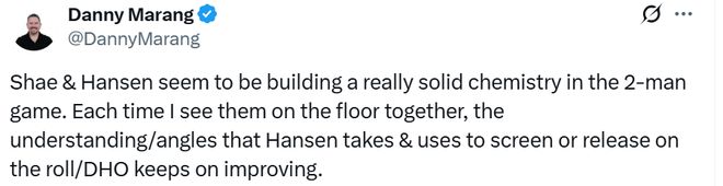 “夏普和杨瀚森在双人配合中似乎正在建立非常扎实的化学反应。每次我看到他们一起在场上,杨瀚森在掩护、顺下或手递手传中选择和利用的理解/角度都在持续提升。”记者写道。